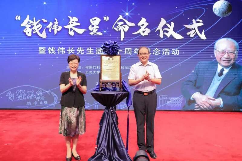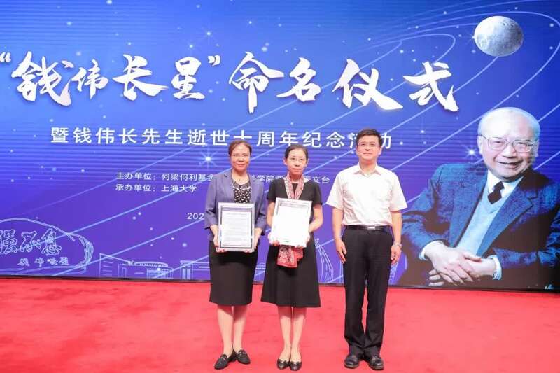 上海市科技工作党委书记刘岩、中国科学院紫金山天文台副台长吴雪峰、上海市教卫工作党委副巡视员杨伟人向钱伟长先生家属钱泽红和上海大学颁送了“钱伟长星”国际命名公报、命名证书及照片。