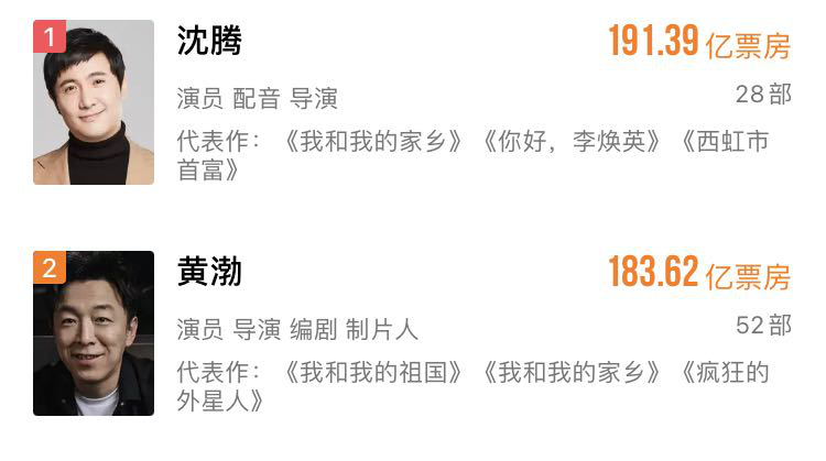 “百亿演员”排行榜里,排在前十的分别是沈腾、黄渤、吴京、王宝强、刘昊然、张译、邓超、徐峥、杜江。他们恰好有一个共同点,都曾出演过《我和我的家乡》《我和我的祖国》这两部电影中至少一部。而观众都知道,这两部电影是拼盘电影,并不是哪一个导演或者演员单扛票房,但在统计时,这两部电影就成了演员/导演的实绩。