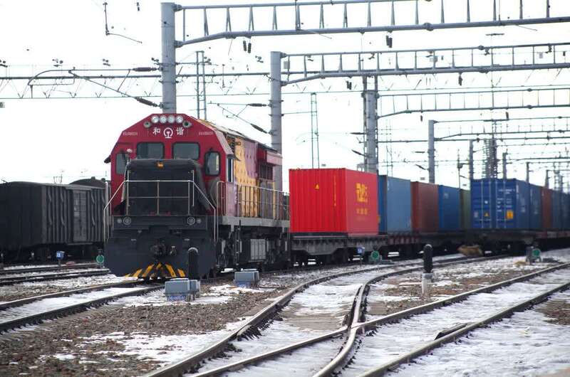 在阿拉山口站,整列中欧班列正进行集装箱换装(中国铁路阿拉山口站提供)