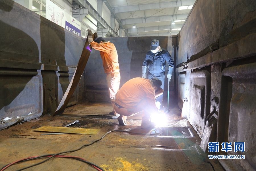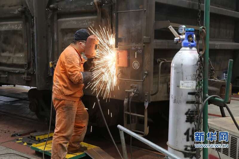 熔接工正在精心焊接维修需要加固的零部件,焊花四处飞溅,工作服上都是焊渣烫得坑坑洼洼的斑点,脖子和胳膊清晰可见点点烫痕。新华网发(张文饶 摄)