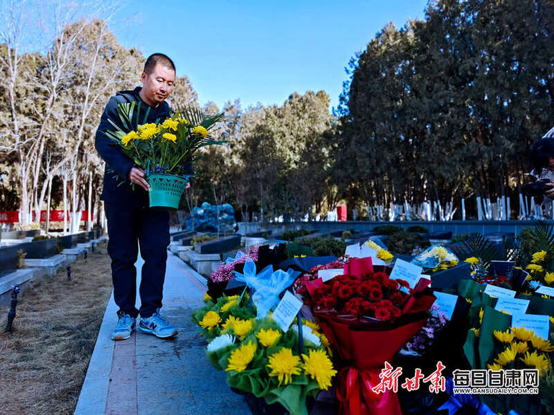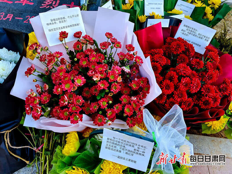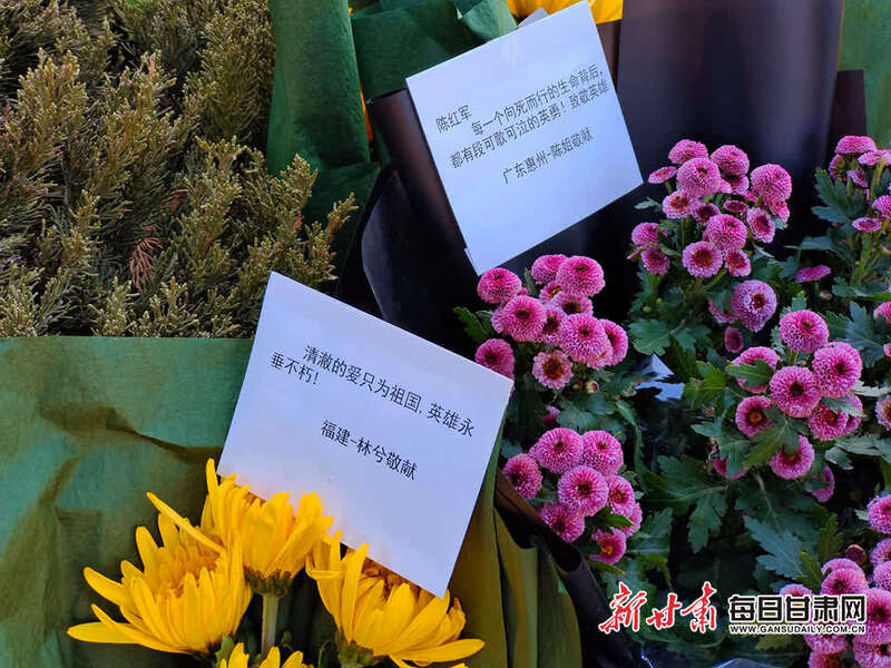 下午3点,一辆载着40束鲜花的三轮车驶到兰州市烈士陵园门前,52岁的兰州市民戴军跑了七八趟,才将40束鲜花搬到了陈红军烈士墓碑前。她将一份份饱含深情的祭奠卡片小心翼翼地粘贴在鲜花上,庄重地将鲜花放置在墓碑前,并深深三鞠躬……如此循环往复,直至离开烈士陵园时太阳已经落山。