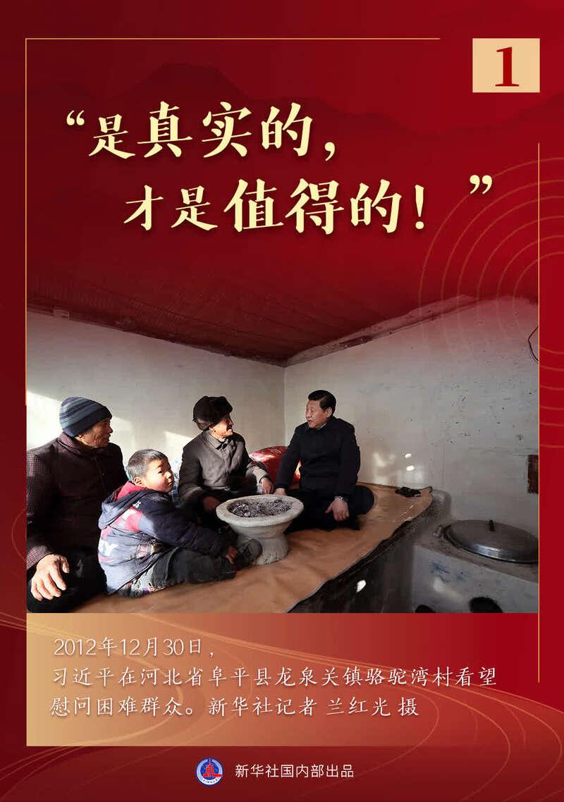 2012年12月30日,太行山深处的河北省阜平县,习近平总书记顶风踏雪来到特困村骆驼湾村。他说:“专程来这里看望大家,就是为了解我国现在的贫困状态和实际情况。你们得让我看到真正情况,不看那些不真实的。所以走得远一点,哪怕看得少一些,是真实的,才是值得的!”