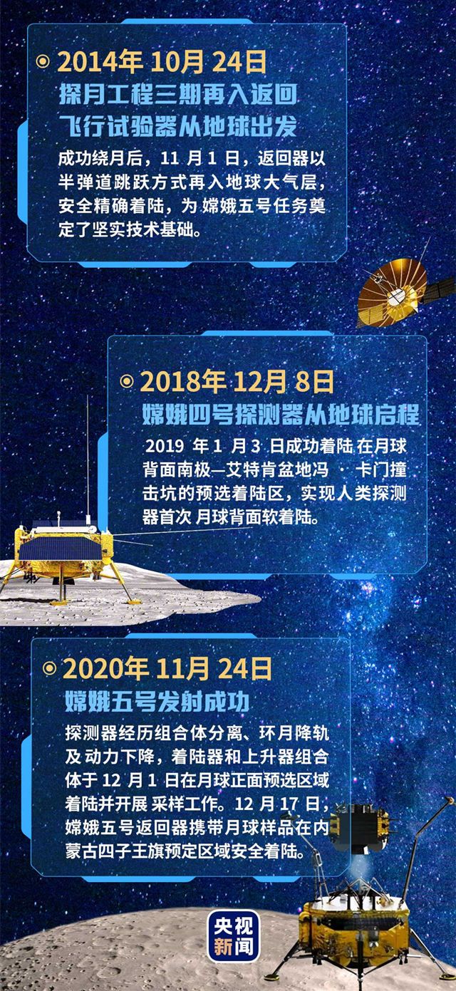 2020年12月17日,历经23天重重考验的嫦娥五号返回器携带月球样品,成功返回地面。中国探月工程“绕、落、回”三步走规划如期完成。