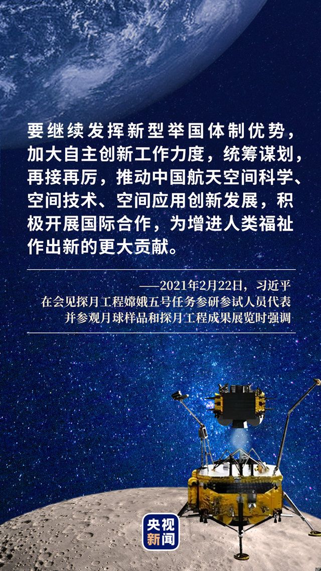 “要弘扬探月精神,发挥新型举国体制优势,勇攀科技高峰,服务国家发展大局,一步一个脚印开启星际探测新征程,不断推进中国航天事业创新发展,为人类和平利用太空作出新的更大贡献。”这是习近平对探月工程取得成就的充分肯定,也是对我国航天人提出新的更高要求。