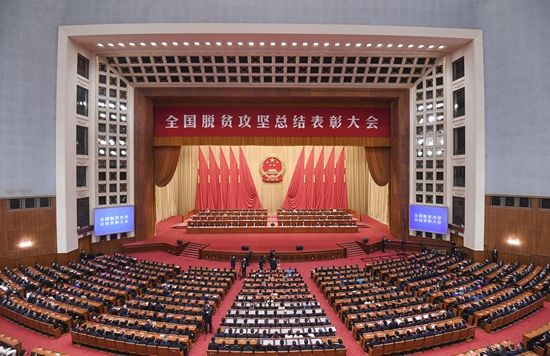 “今天,我们隆重召开大会,庄严宣告,经过全党全国各族人民共同努力,在迎来中国共产党成立一百周年的重要时刻,我国脱贫攻坚战取得了全面胜利,现行标准下9899万农村贫困人口全部脱贫,832个贫困县全部摘帽,12.8万个贫困村全部出列,区域性整体贫困得到解决,完成了消除绝对贫困的艰巨任务,创造了又一个彪炳史册的人间奇迹!这是中国人民的伟大光荣,是中国共产党的伟大光荣,是中华民族的伟大光荣。”