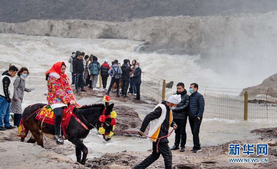 2月24日,游人在陕西壶口瀑布景区游览(无人机照片)。