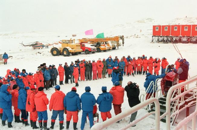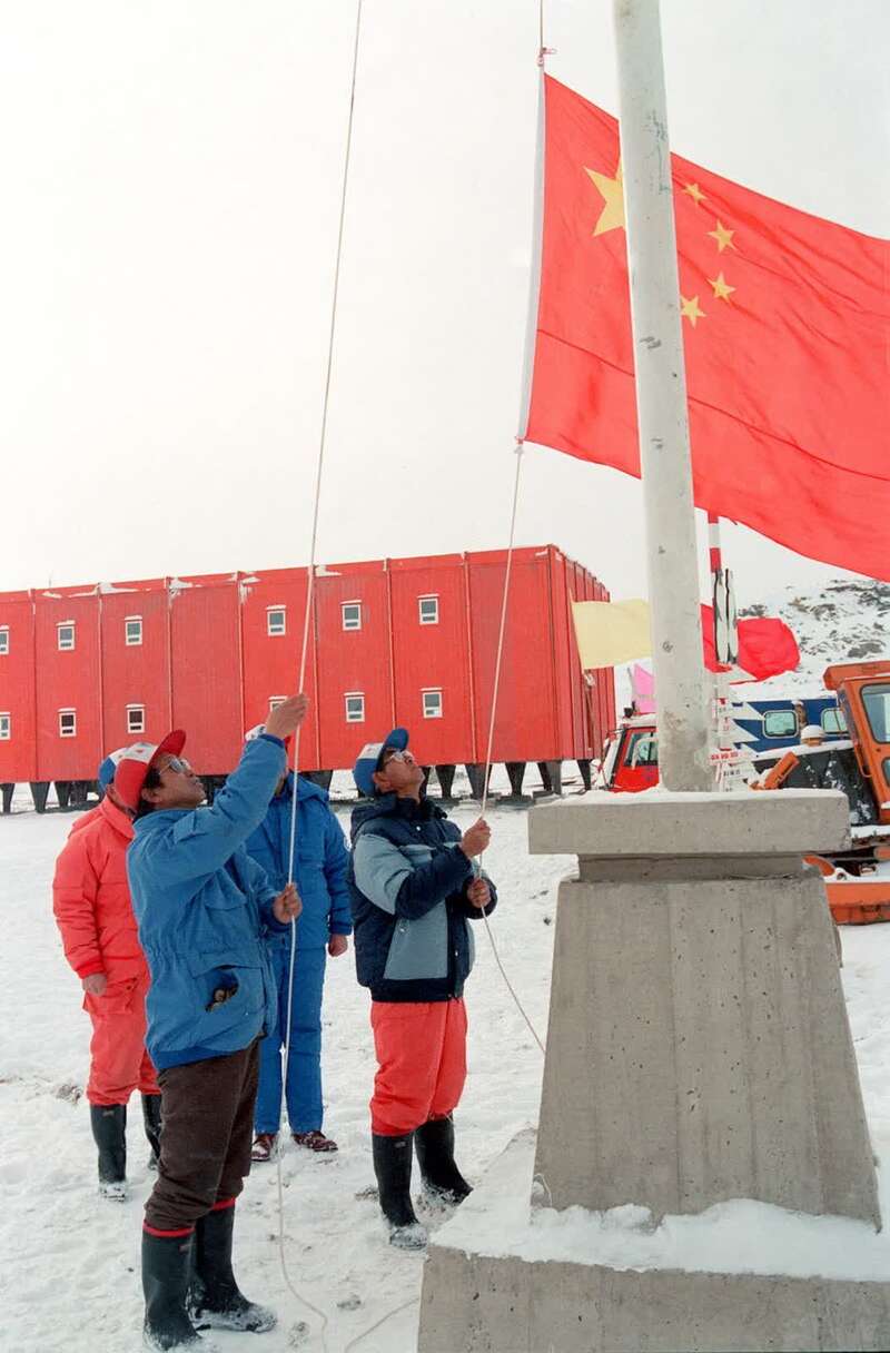 △在1989年1月26日中山站举行的奠基仪式上,队员们升起鲜艳的五星红旗