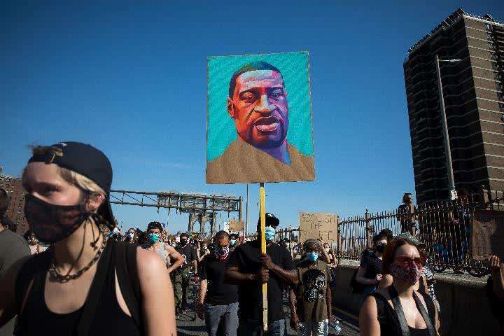 2020年6月9日,抗议者手举乔治·弗洛伊德的画像在美国纽约街头参加抗议活动。(新华社发,郭克摄)