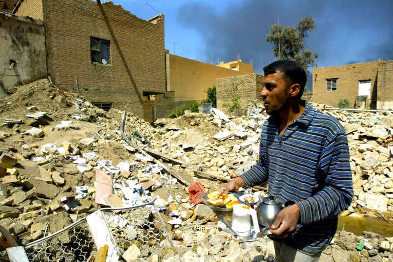 2003年4月1日,一名伊拉克男子端着一盘食品从巴格达一处被美军炸毁的房屋前走过。(新华社发)