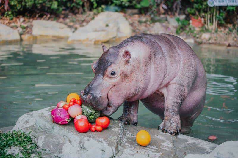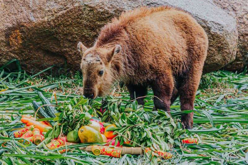 保育团队介绍,把新鲜的各款苹果、红萝卜、红薯、树叶等,裹成圆圆大大的美味“汤圆”,这些原料都是动物们日常喜欢的食物,在元宵节做成“汤圆”。保育员端上“汤圆”,金牛(羚牛)、大熊猫、黑猩猩、小河马纷纷大口吃起来,两只黑猩猩更是互相争抢,让游客忍俊不禁。