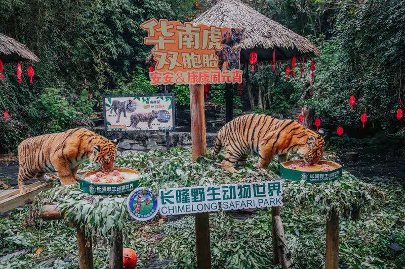华南虎双胞胎在撒野乐园率先体验闹元宵、吃汤圆。现场,亲子家庭为华南虎制作可口的“汤圆”。保育团队专门做了长长的勺子,把精心制作的“汤圆”喂给“安安”“康康”这对华南虎兄弟。