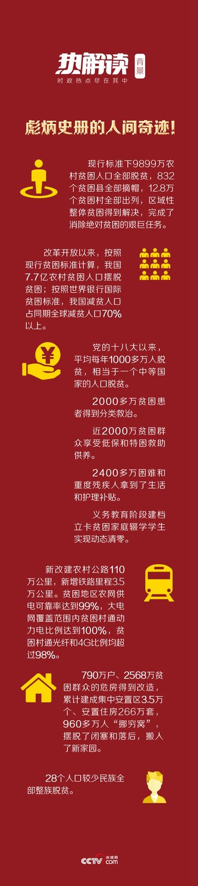 而今,中华民族千百年来存在的绝对贫困,在我们这一代人的手中历史性地得到解决。纵览古今、环顾全球,没有哪一个国家能在这么短的时间内实现几亿人脱贫。