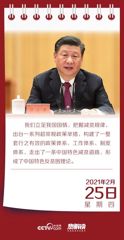 “我们立足我国国情,把握减贫规律,出台一系列超常规政策举措,构建了一整套行之有效的政策体系、工作体系、制度体系,走出了一条中国特色减贫道路,形成了中国特色反贫困理论。”