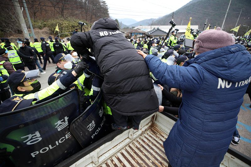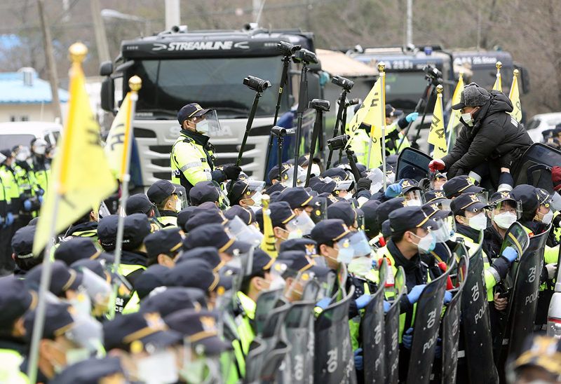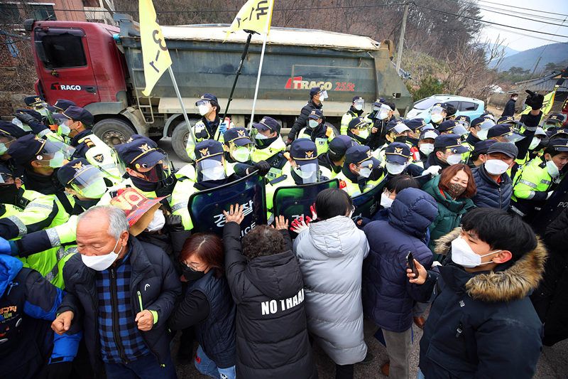 当地时间2021年2月25日上午,韩国国防部向庆尚北道星州郡“萨德”基地运输物资,当地居民誓死抗议,遭警方强制疏散,导致4名民众昏厥或遭受跌打损伤。最终,共有42辆运输物资的车辆驶入基地。这是时隔34天,韩军再次向“萨德”基地运输物资。