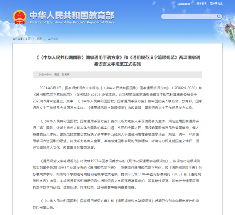 2021年3月1日,国家语委语言文字规范《〈中华人民共和国国歌〉国家通用手语方案》(GF0024-2020)和《通用规范汉字笔顺规范》(GF0023-2020)正式实施。两项规范由国家语委语言文字规范标准审定委员会于2020年9月审定通过。其中,《〈中华人民共和国国歌〉国家通用手语方案》由中国残疾人联合会、教育部、国家语言文字工作委员会共同发布实施。《通用规范汉字笔顺规范》由教育部、国家语言文字工作委员发布实施。