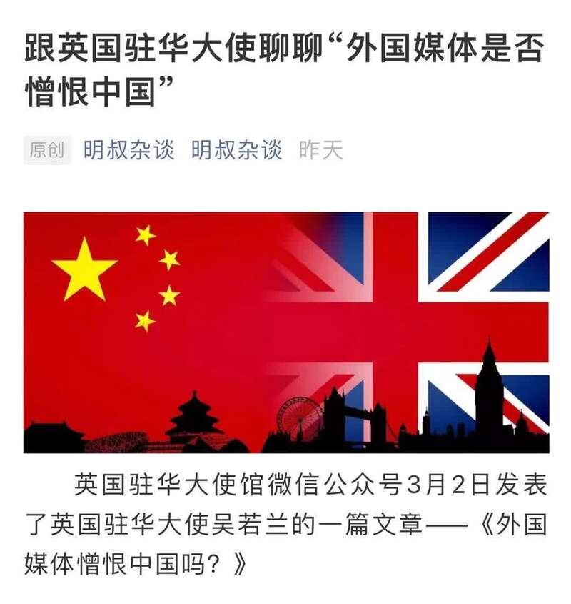 3月3日,微信公众号“明叔杂谈”发表题为《跟英国驻华大使聊聊“外国媒体是否憎恨中国”》谈及该篇文章,也分享了自己的一些看法。文章写道: