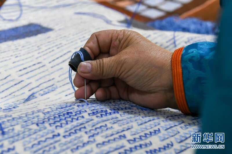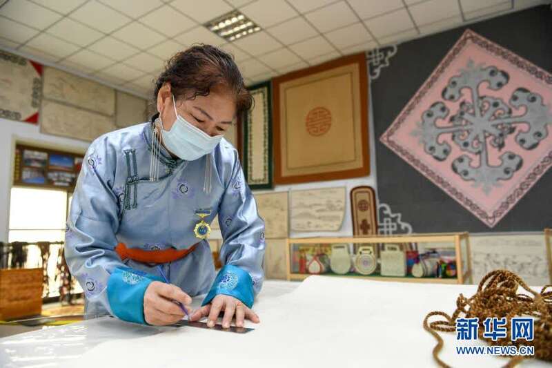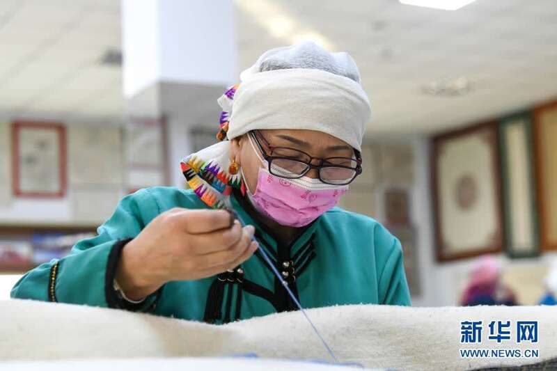 3月4日,在苏尼特左旗非物质文化遗产保护中心,绣娘在绣制作品《一叶红船映初心》。