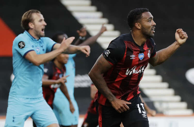 2020年7月9日,伯恩茅斯队球员威尔逊(右)在进球后庆祝,但随后这粒进球因手球被判无效。新华社/路透