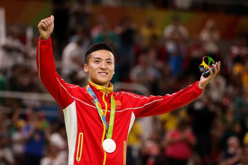 中国选手董栋在里约奥运会男子蹦床颁奖仪式上。新华社记者郑焕松摄