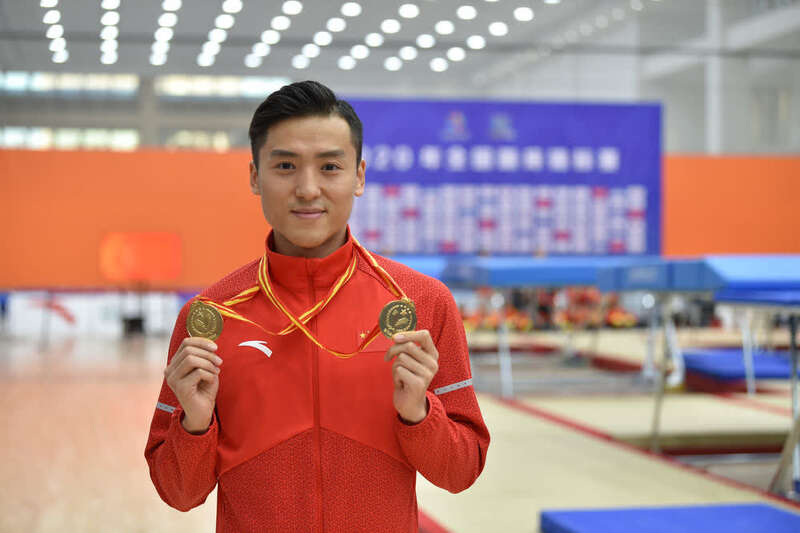 2020年10月3日,董栋展示本届全国蹦床锦标赛获得的奖牌。新华社发(孙凡越摄)
