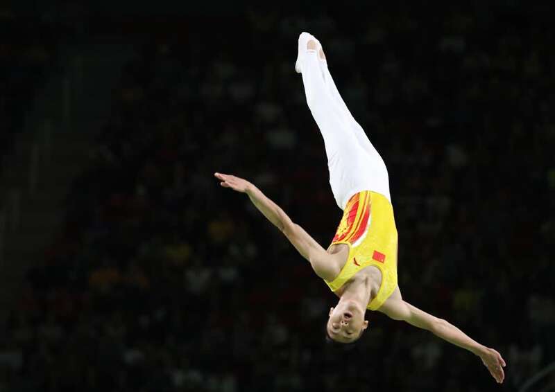 里约奥运会男子蹦床比赛,中国选手董栋在比赛中。新华社发