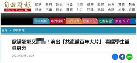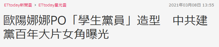 此事也引起了台媒的关注,台湾“ETtoday新闻云”以“欧阳娜娜PO‘学生党员’造型 中共建党百年大片女角曝光”为题做了报道。