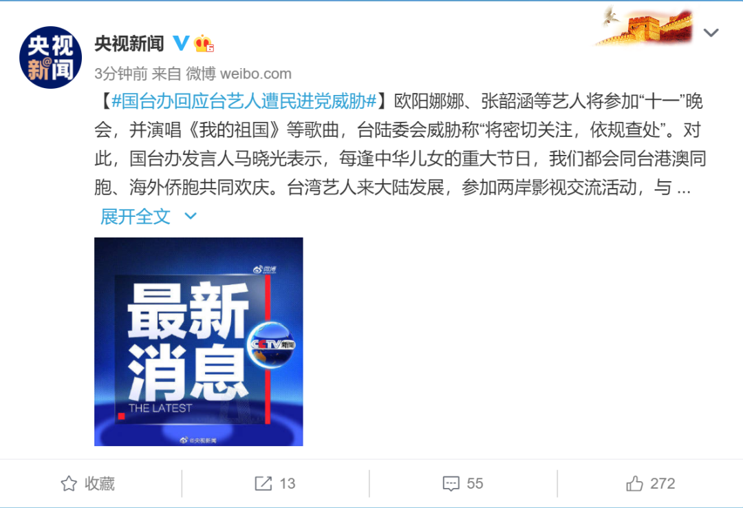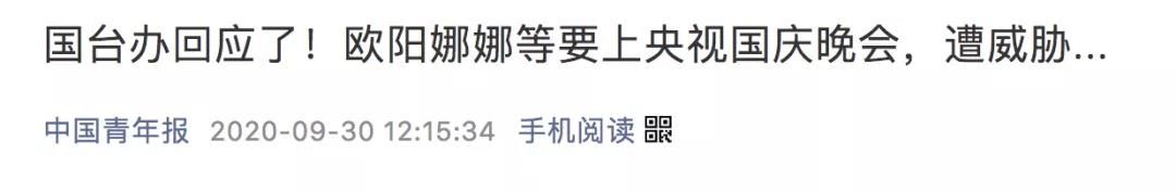 此前,相似的一幕也曾发生。2020年9月,欧阳娜娜、张韶涵等艺人将参加“十一”晚会,并演唱《我的祖国》等歌曲,台湾陆委会称,大陆为办理十一庆典及活动,安排台湾相关人士参与,目的是宣传其“一国两制台湾方案”,对台进行施压。台湾陆委会还威胁将会密切关注相关情况,倘有涉及违反两岸条例相关规定,将依法查处。