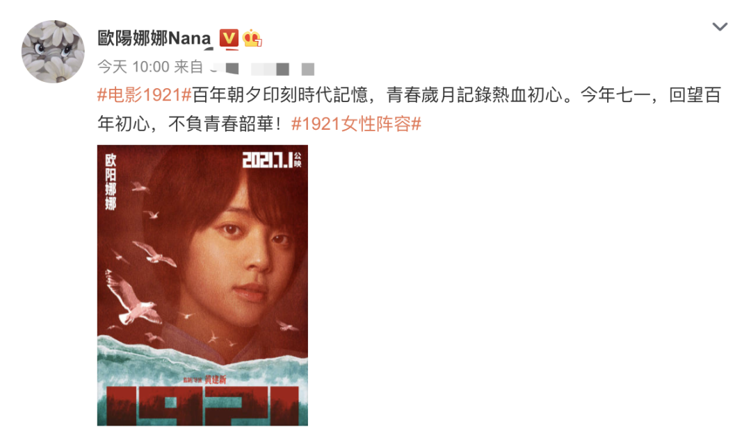 欧阳娜娜在微博发布剧照时写下,“百年朝夕印刻时代记忆,青春岁月记录热血初心。今年七一,回望百年初心,不负青春韶华!”