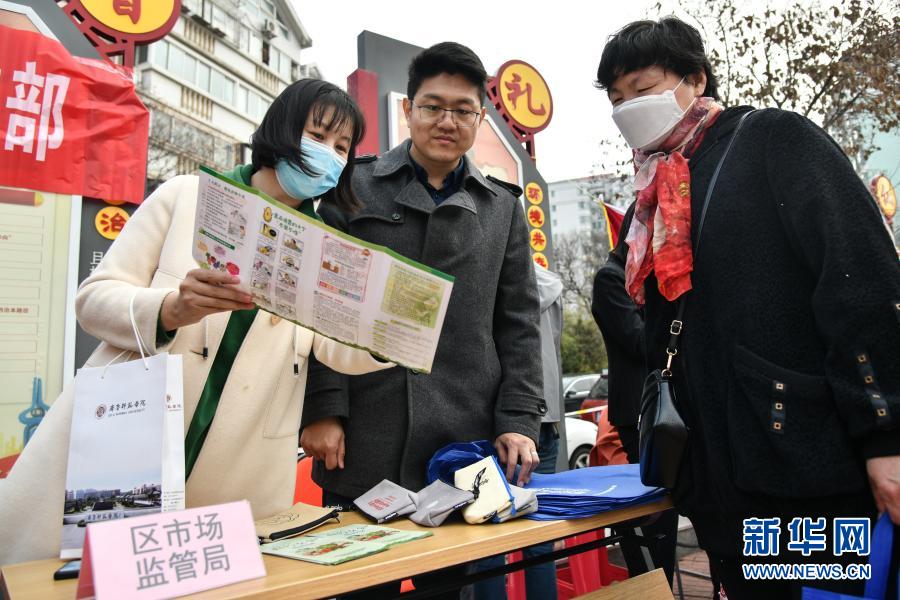 3月13日,在济南市一社区,工作人员为社区居民宣传消费知识。
