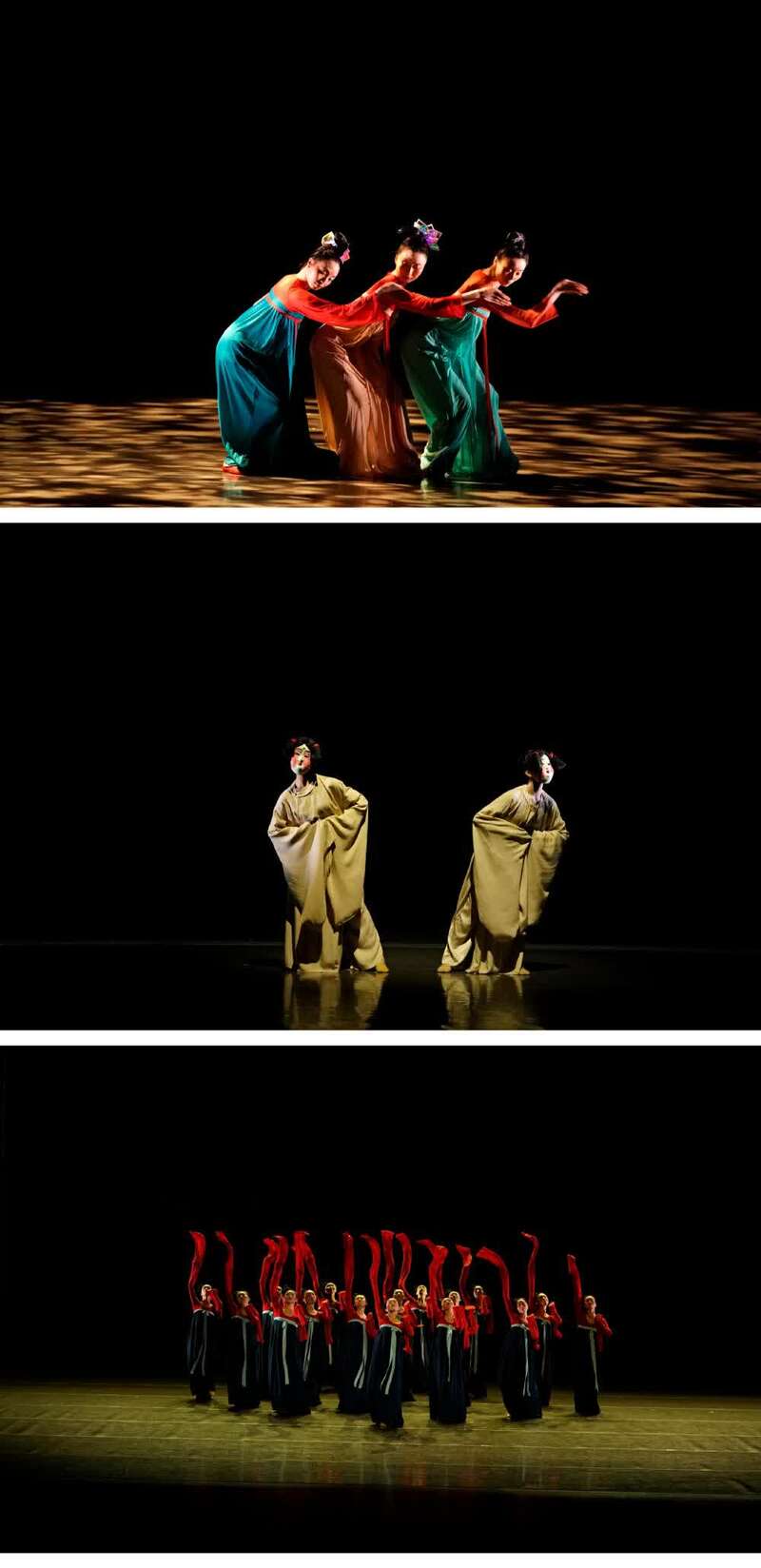 《俑》系列所有作品都有的舞蹈、服饰、妆发,都有形式依据,同时又简洁当代。在《俑》《俑Ⅱ》中,服装主体选用修长的筒裙筒袖,点缀了现代感的小高领设计。《俑Ⅲ》则更强调局部,舞蹈《唐乐宫图》就参考了唐代锦鞋的式样,鞋头高翘翻卷,形似卷云。过去与当下,在剧场时空中相连。