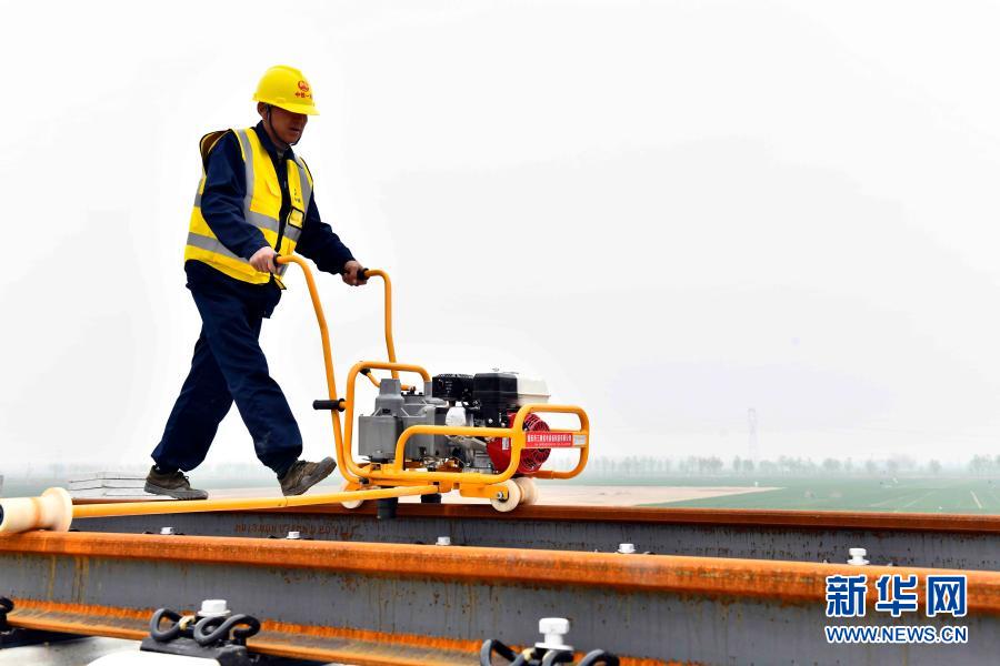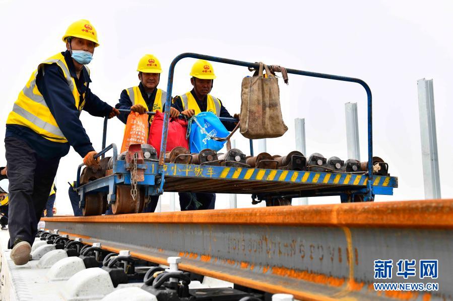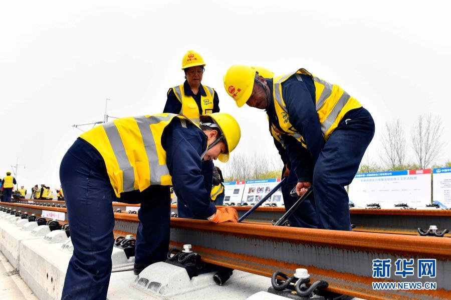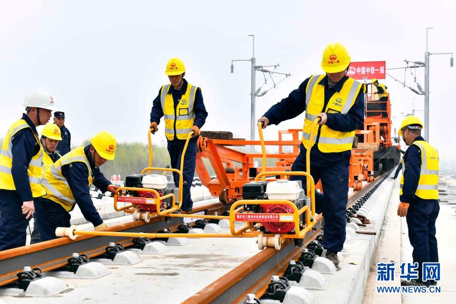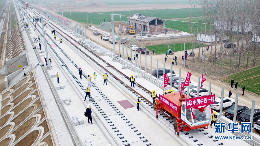 3月15日,在日兰高铁山东嘉祥县段,中铁一局的工作人员进行铺轨作业。