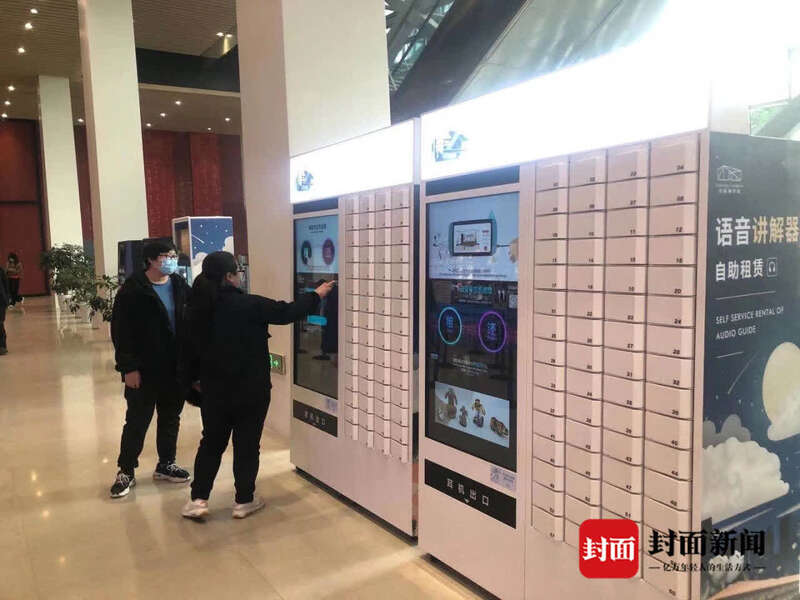 成都博物馆科技信息中心主任介绍,成博在几个展厅的入口处都摆放了讲解器租赁柜,就像共享充电宝一样,方便观众自助租借、聆听展览的讲解。有趣的是,这台讲解器可以对成博的常设展、临展进行讲解,还收录了中文、英语等多个语言版本,满足不同国籍观众的看展需求。