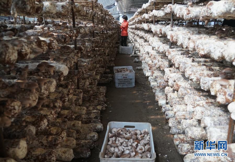 3月16日,迁安市杨各庄镇弘庄食用菌培育合作社的社员在采摘香菇。新华社记者 杨世尧 摄