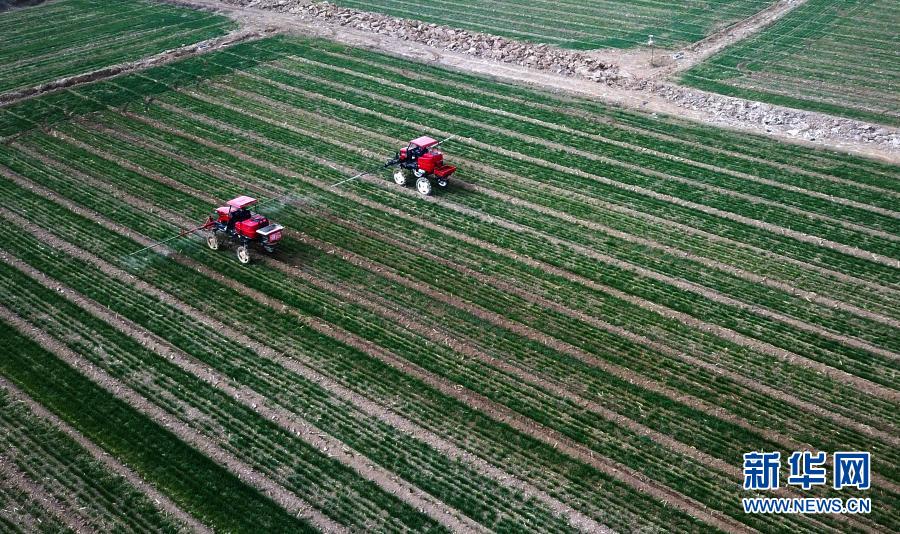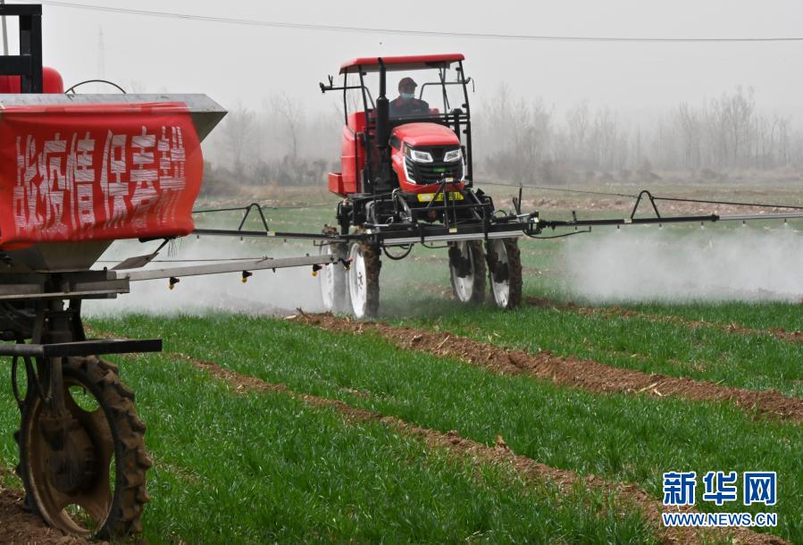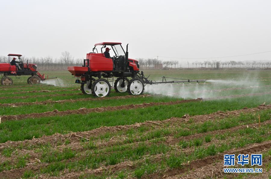 3月16日,大型自走式喷杆喷雾机在洪洞县大槐树镇秦堡村麦田中作业。新华社记者马毅敏摄
