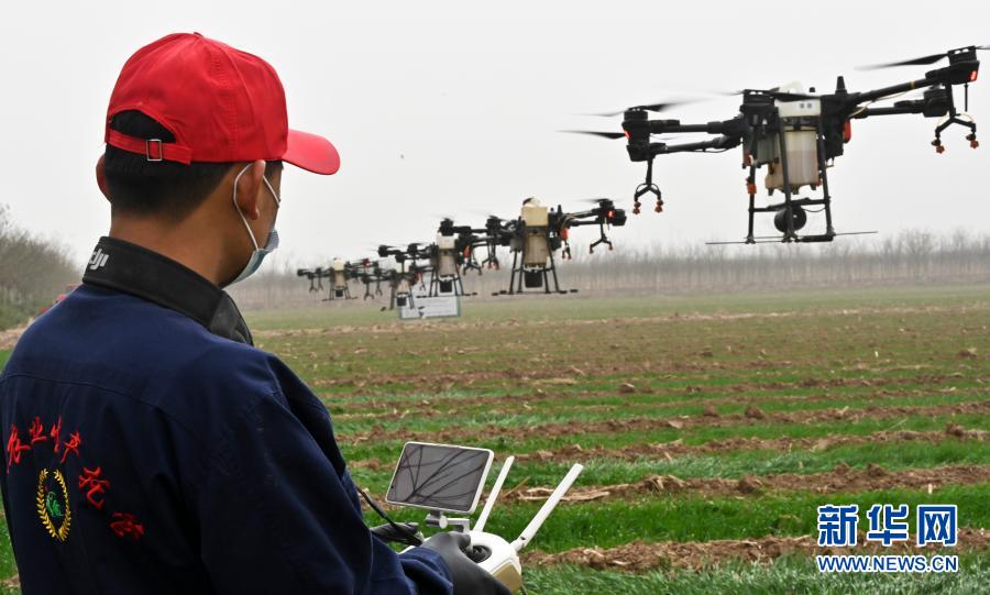 3月16日,工作人员操纵植保无人机在洪洞县大槐树镇冯张村麦田中作业。新华社记者马毅敏摄