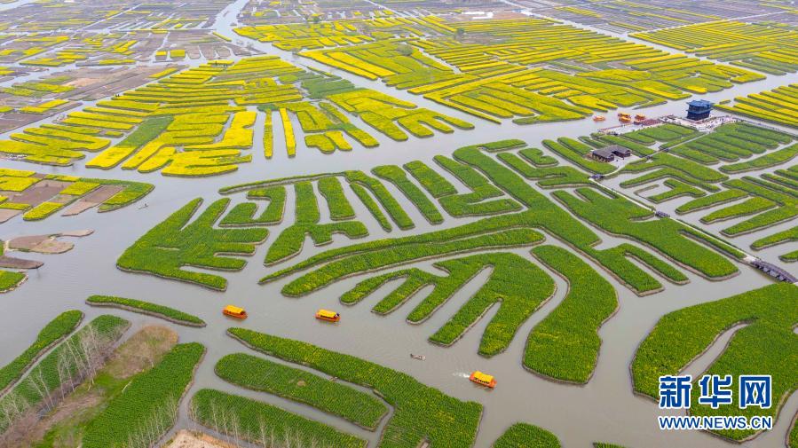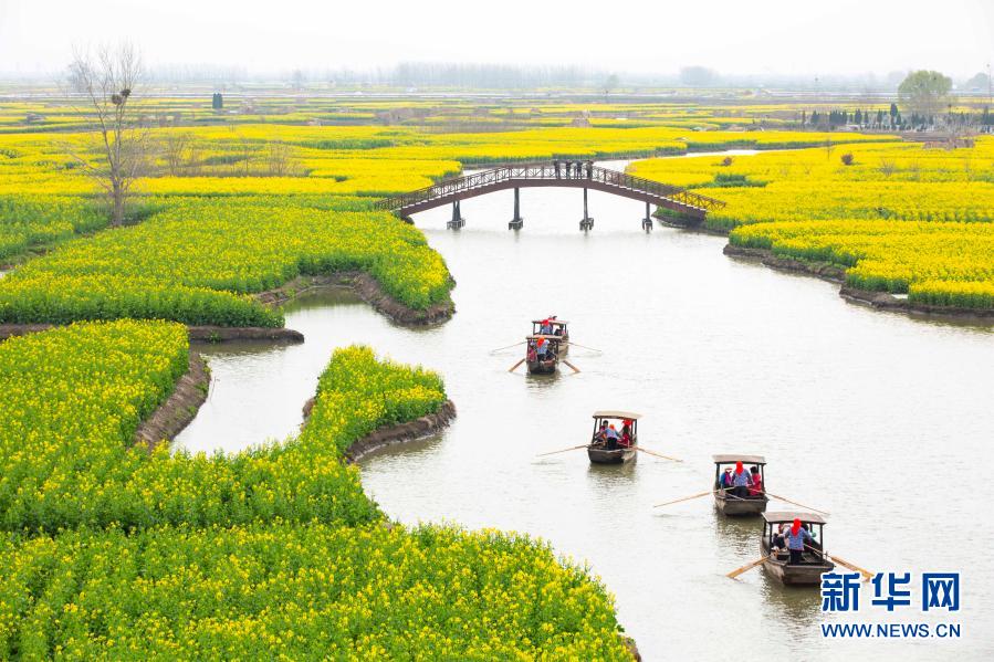 3月18日,游客在兴化市千垛景区乘船游览(无人机照片)。