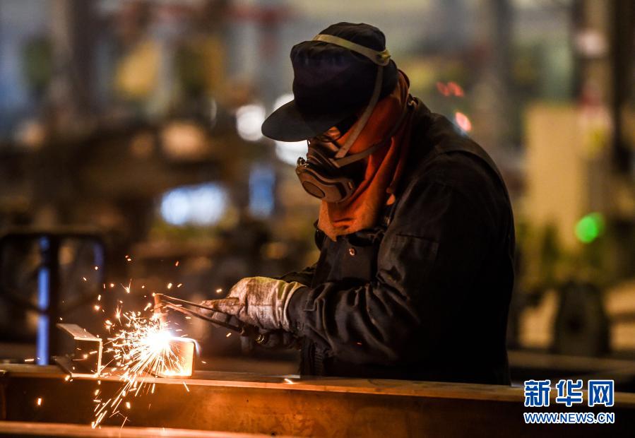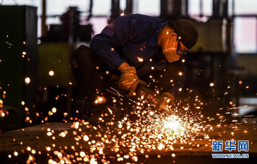 3月17日,在鄂尔多斯装备制造工业园区内,一家特种车辆制造有限责任公司的工人在切割钢板。新华社记者 彭源 摄