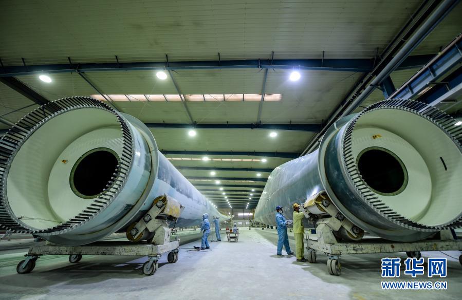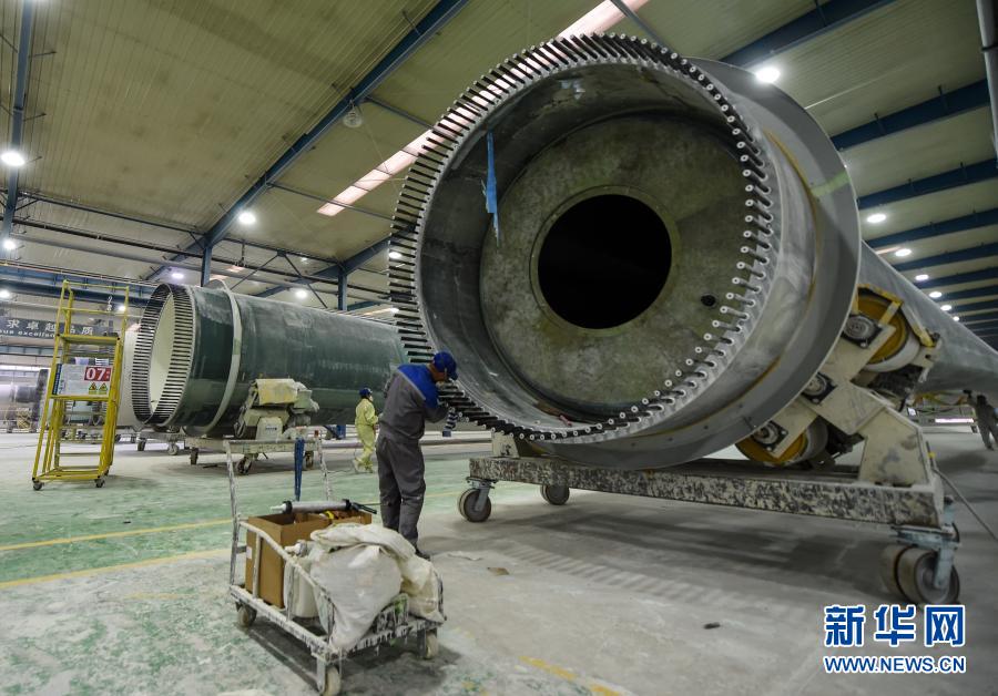 3月17日,在鄂尔多斯装备制造工业园区内,一家新材料科技股份有限公司蒙西分公司的工人在进行风叶壳外部补强作业。