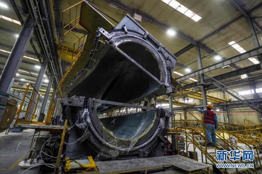 3月17日,在鄂尔多斯装备制造工业园区内,一家新材料科技股份有限公司蒙西分公司的工人在车间内监视风叶合模过程。新华社记者 彭源 摄