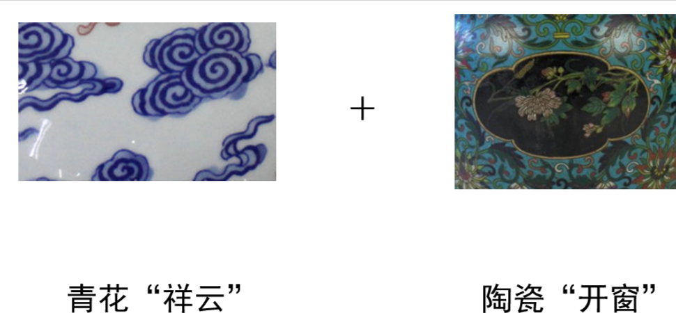 “祥云”图案及背景的“开窗”结构均为景德镇古陶瓷常用的元素,代表了陶瓷属性,同时具有吉祥寓意和对外展现景德镇陶瓷文化的一个“窗口”内涵。