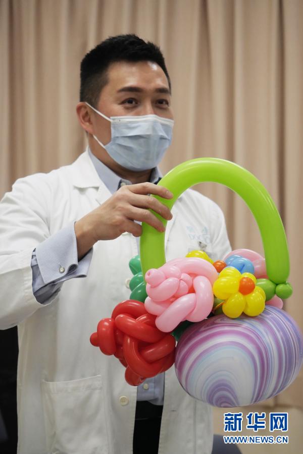 在香港东区医院,“气球大夫”陈诺文医生展示他制作的气球花篮(3月16日摄)。