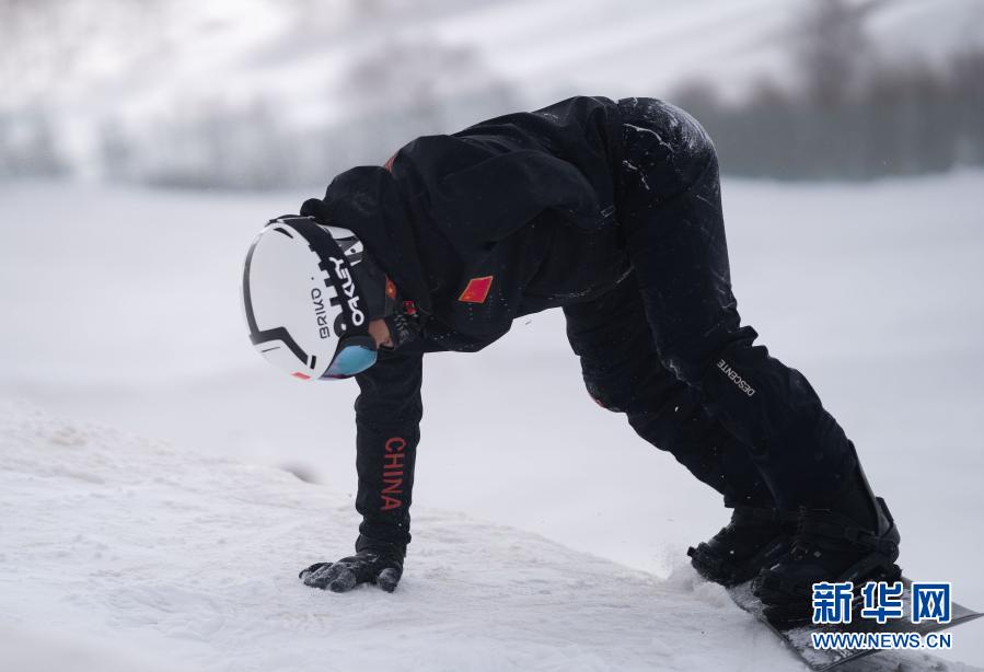 3月20日,冬残奥会国家集训队单板滑雪运动员贺一朋在冬残奥会训练基地训练。