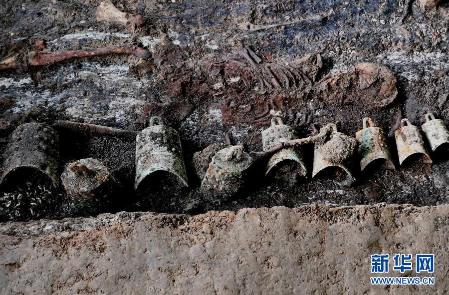 这是河南洛阳徐阳墓地标号为M15的墓葬出土的编钟(2020年11月27日摄)。