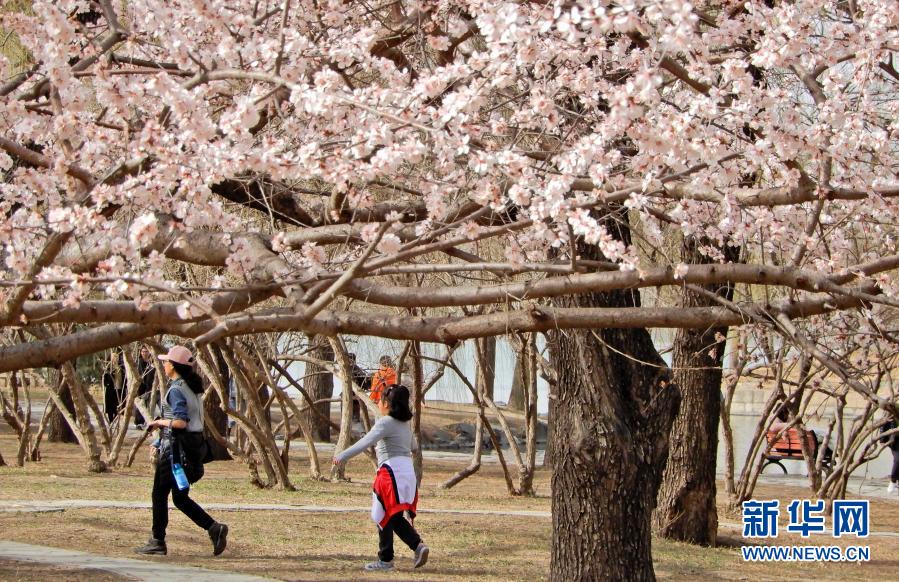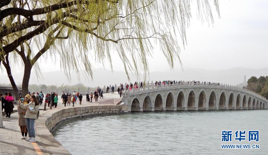 随着气温回升,北京颐和园桃花盛开,柳树吐新,吸引游人前来踏青赏花。