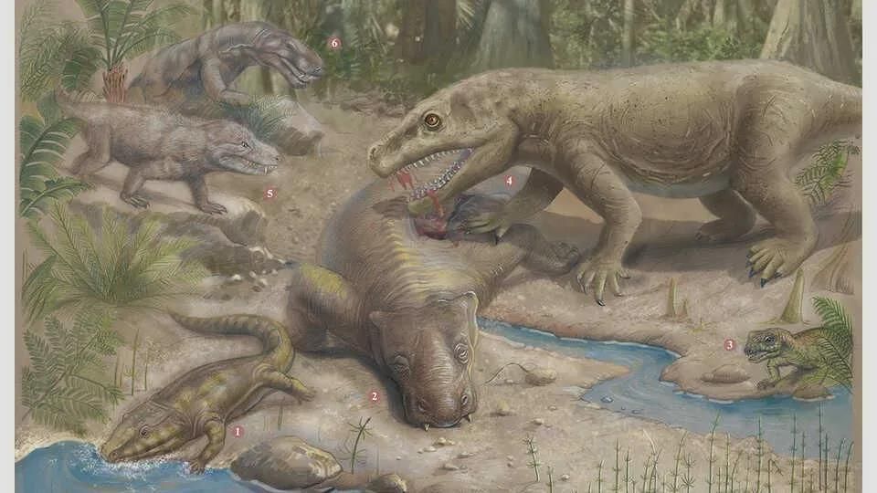 二叠纪末大灭绝后陆地生态系统发生根本性变化,在大灾难中幸存下来的二齿兽一统江湖,成为陆地之王。图片来源:郭肖聪