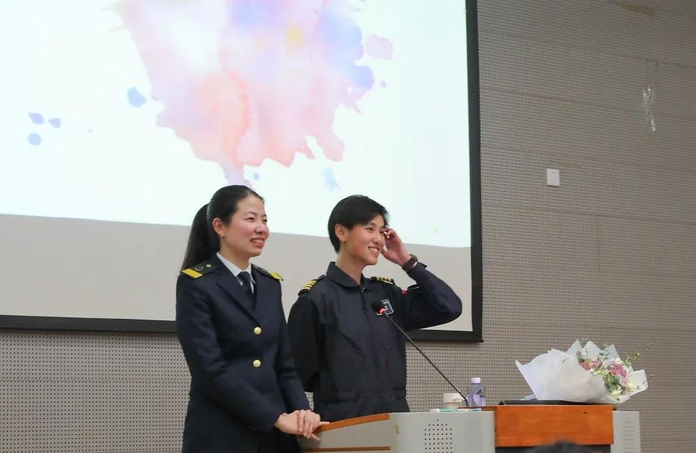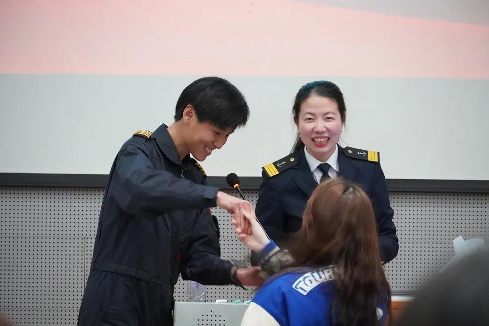 宋寅的出现极大地鼓舞了海大“航运强国建设的接班人们”。在互动过程中,一位留着利落短发的女生引起了宋寅的注意,她是2018年考入学校航海专业的黄丹同学。身为一名心怀航海梦的女生,在面对男女的生理差异时,她退缩了。听闻宋寅的事例,这位女生仿佛看到了实现梦想的希望。她在询问宋寅该如何实现航海梦时,宋寅用“不要迷茫,一定会有机会在远方等着你”来激励这位“曾经的自己”,在这位立志步入职业生涯的学生心中埋下了梦想的种子。