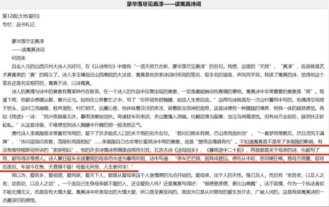 这首名为《送母回乡》的诗歌,在各大网站和诗词读本中被署名为李商隐所作。3月18日,在豆瓣网友的考证下,发现其真实作者竟是当代诗人寓真。
