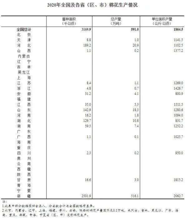2020年全国及各省(区、市)棉花生产情况。来源:国家统计局