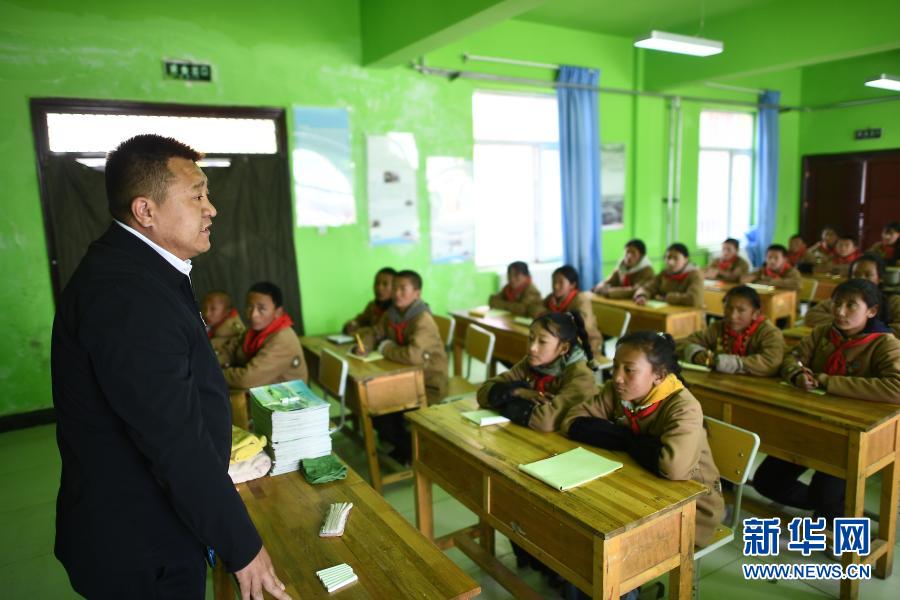 3月23日,索南旦正(左)在吉尕小学青少年生态道德教育基地授课。