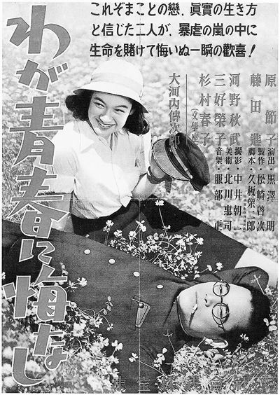 1946年,黑泽明也拍了一部聚焦“间谍之妻”的电影,《我对青春无悔》。它以真实发生在战时日本高校的民主运动为蓝本,主要人物关系也是一女两男三个同学,两男对一女均有情愫,女子与其中一男结为夫妻;时代背景也是日本发动侵略战争期间;男同学同样是分别选择了一正一邪两条道路,一个为反战为自由献身,另一个成了法西斯的帮凶,昔年好友最终因为立场不同视如寇雠。